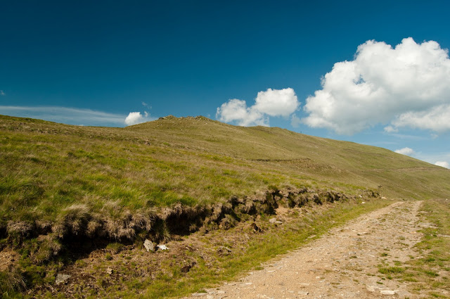 Inaintam pe triunghi albastru. Este poteca turistica, cu multe pietre. Tragem de biciclete si ele trag de noi. Datorita oboselii, apar si nervii. Ne bate si vantul destul de tare si suntem nitel stresati sa nu ne prinda noaptea.