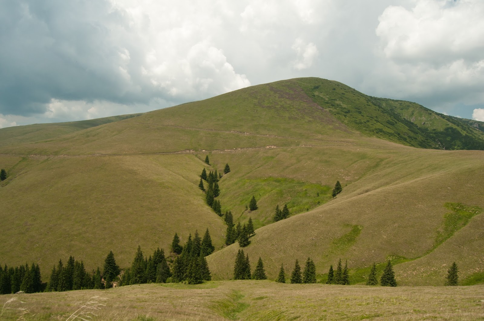 Timpii cresc si, pe masura ce inaintam pe culme, ne prindem ca nu ajungem la Galbena. Drept urmare, inainte de a doua culme zdravana (panta prostului, cum i s-ar mai spune), ne decidem sa urmam traseul turistic (triunghiul albastru) catre stanga, pe umerii culmii, in loc sa o tinem e linia platoului. Stim ca mai sunt inca doua de urcat, chiar mai inalte,dupa ea. Ne hotaram sa cautam un loc de campare.