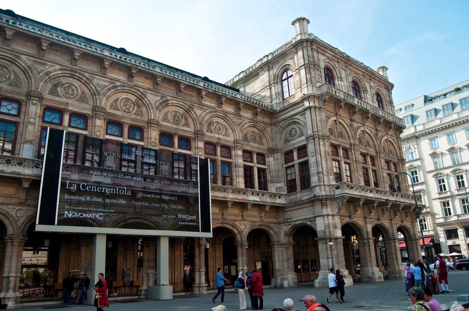 Odata ajunsi in fata Operei, observam cateva randuri de scaune aranjate cu privirea catre un ecran mare. Urmeaza ca spectacolul din interiorul Operei sa fie transmis si afara.
