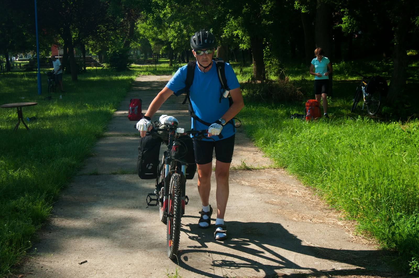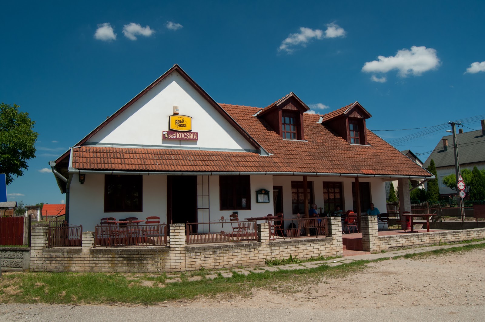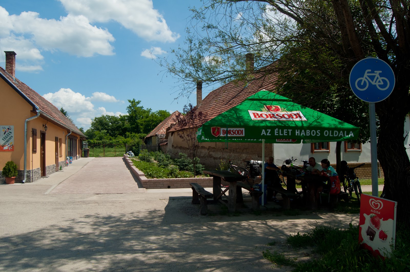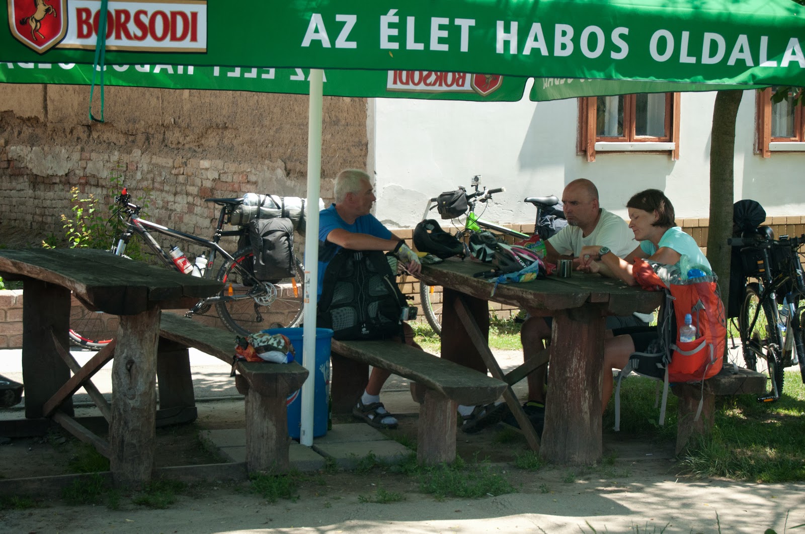 In Bikacs, hotaram sa ne tragem la umbra pentru o pauza. Gasim un birt local ce avea niste banci din lemn si umbrele mari. Luam cate-o bere Soproni si intram in vorba cu un domn de-al locului. Ne intelegem cat de cat, ii zicem de unde suntem, de unde venim si incotro ne indreptam.
