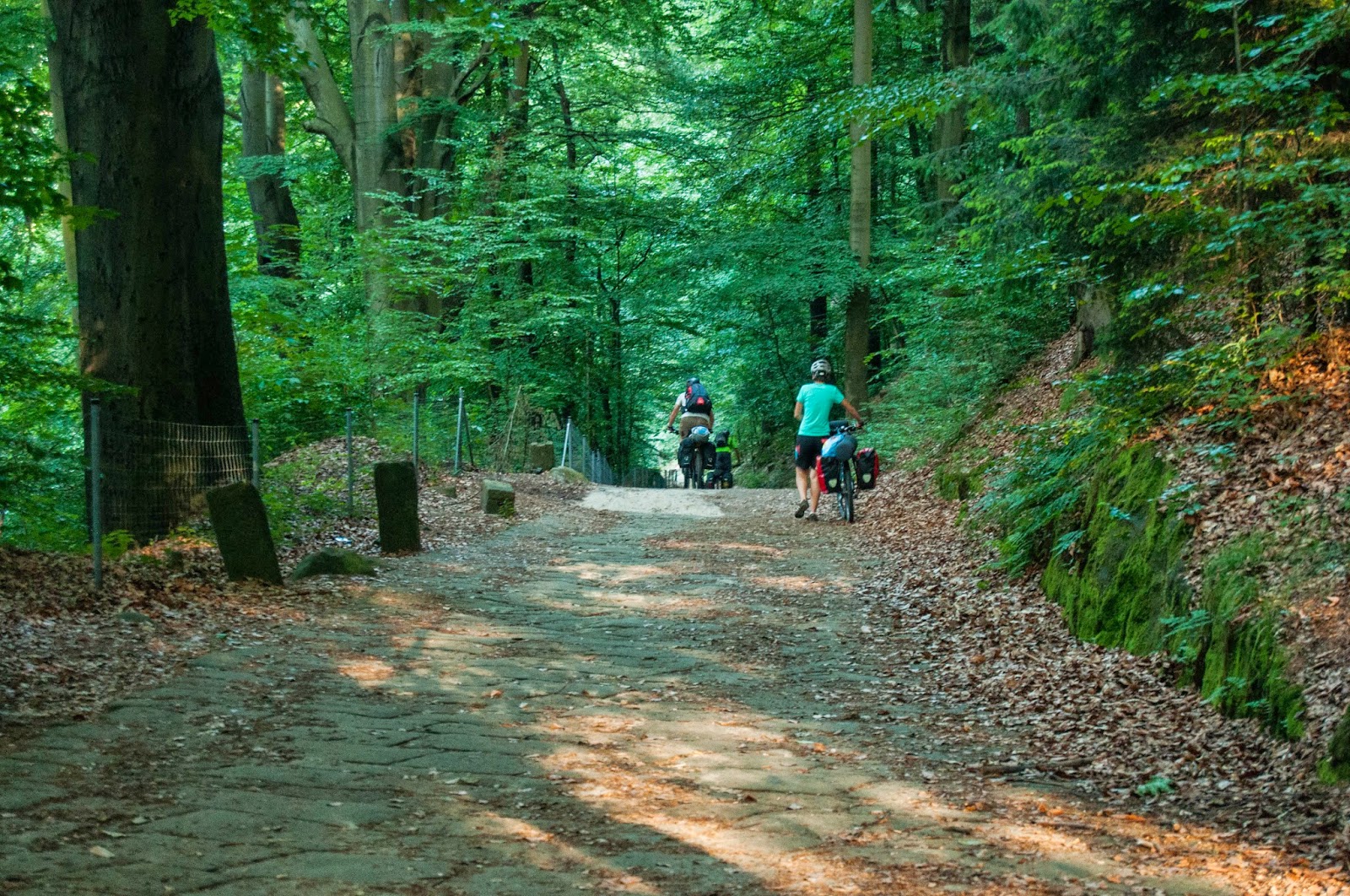Imediat dupa castel, ruta se transforma intr-una de plimbare la picior, cu pietre mari de rau, slefuite. Mergem pe langa biciclete, mai putin Marius care-i ceva mai insistent.