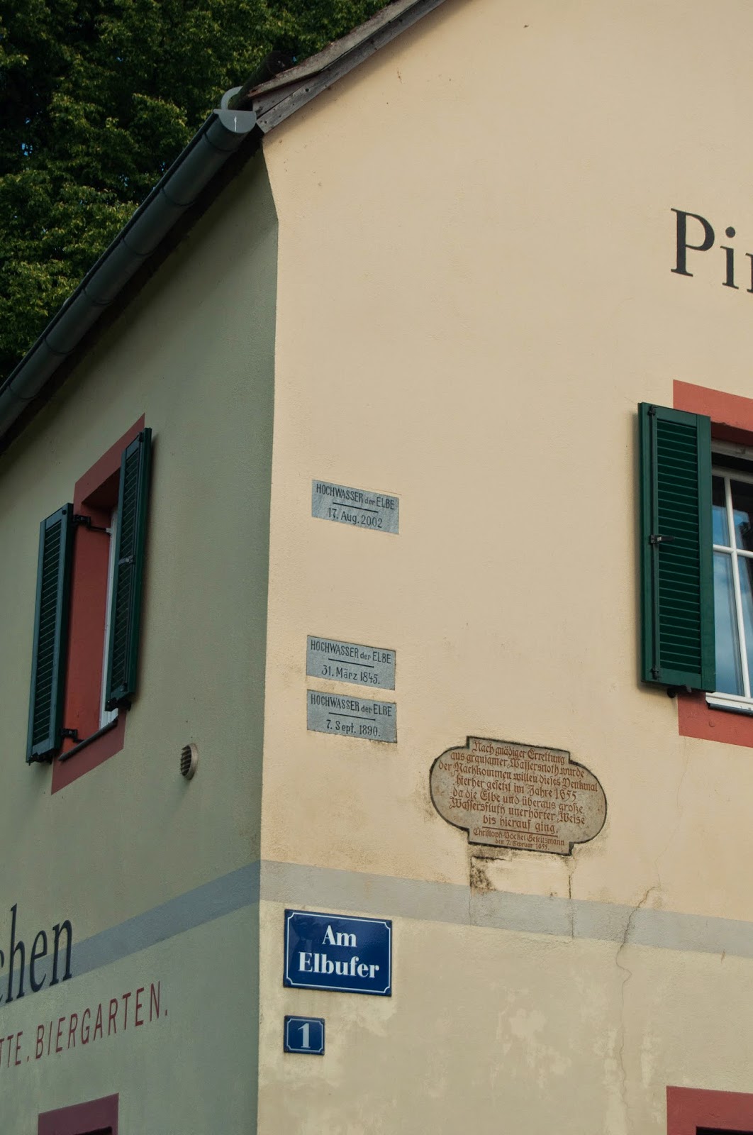 Pe o cladire gasim marcate cotele Elbei de-a lungul vremii, in timpul inundatiilor. Impresionant si greu de imaginat ca satul de pe malul celalalt, pe care tocmai l-am fotografiat, a fost sub ape. Si nu o singura data. Cel mai mare nivel pare ca a fost atins in timpul inundatiilor din 2002.