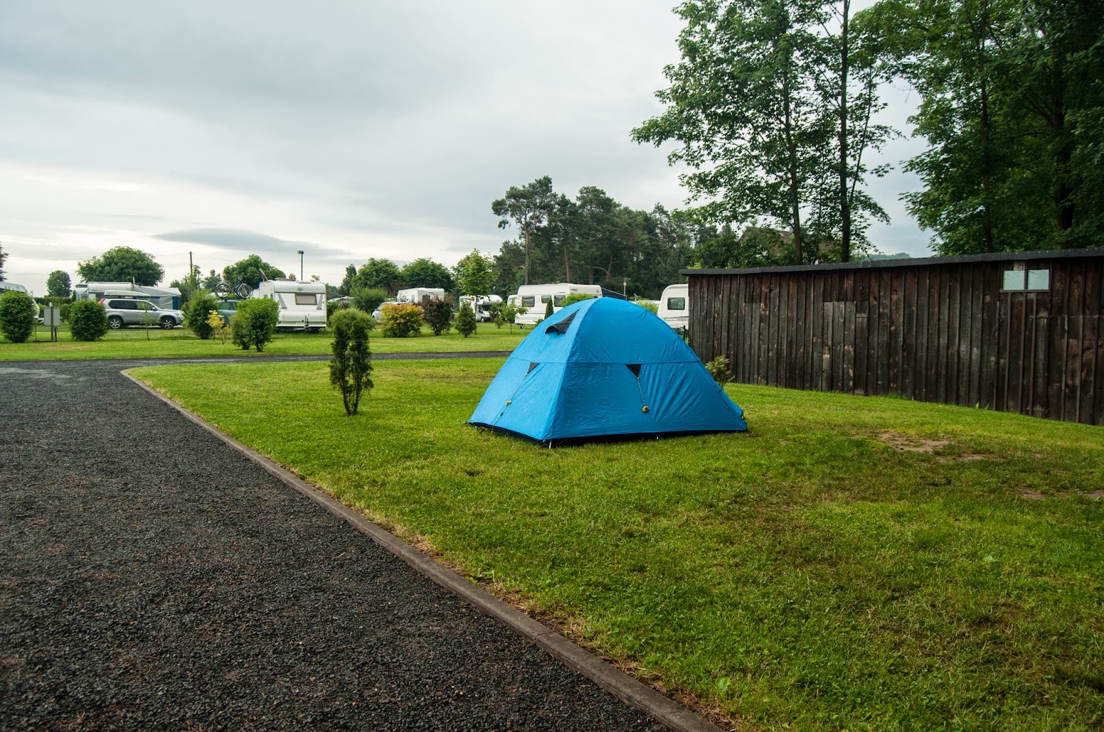 Aici, dupa ce pedalam vreun kilometru prin padure, dam de poarta campingului. Seamana cu vechile tabere de copii de pe la noi.
