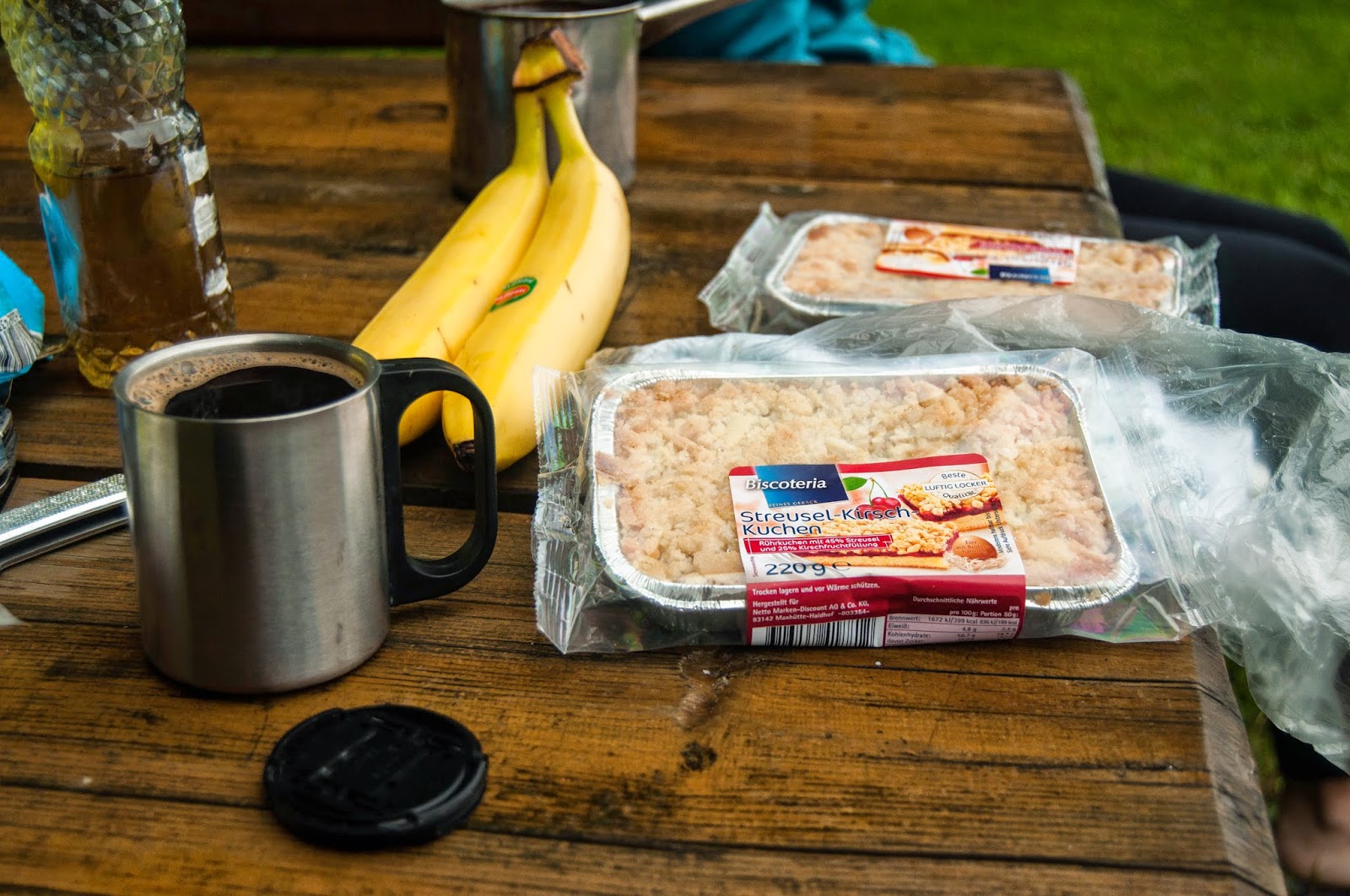 Avem o masuta din lemn si doua banci langa corturi, intr-un soi de foisor mic. Ne punem la masa (ce cumparasem din Litomerice) si la palinca.
