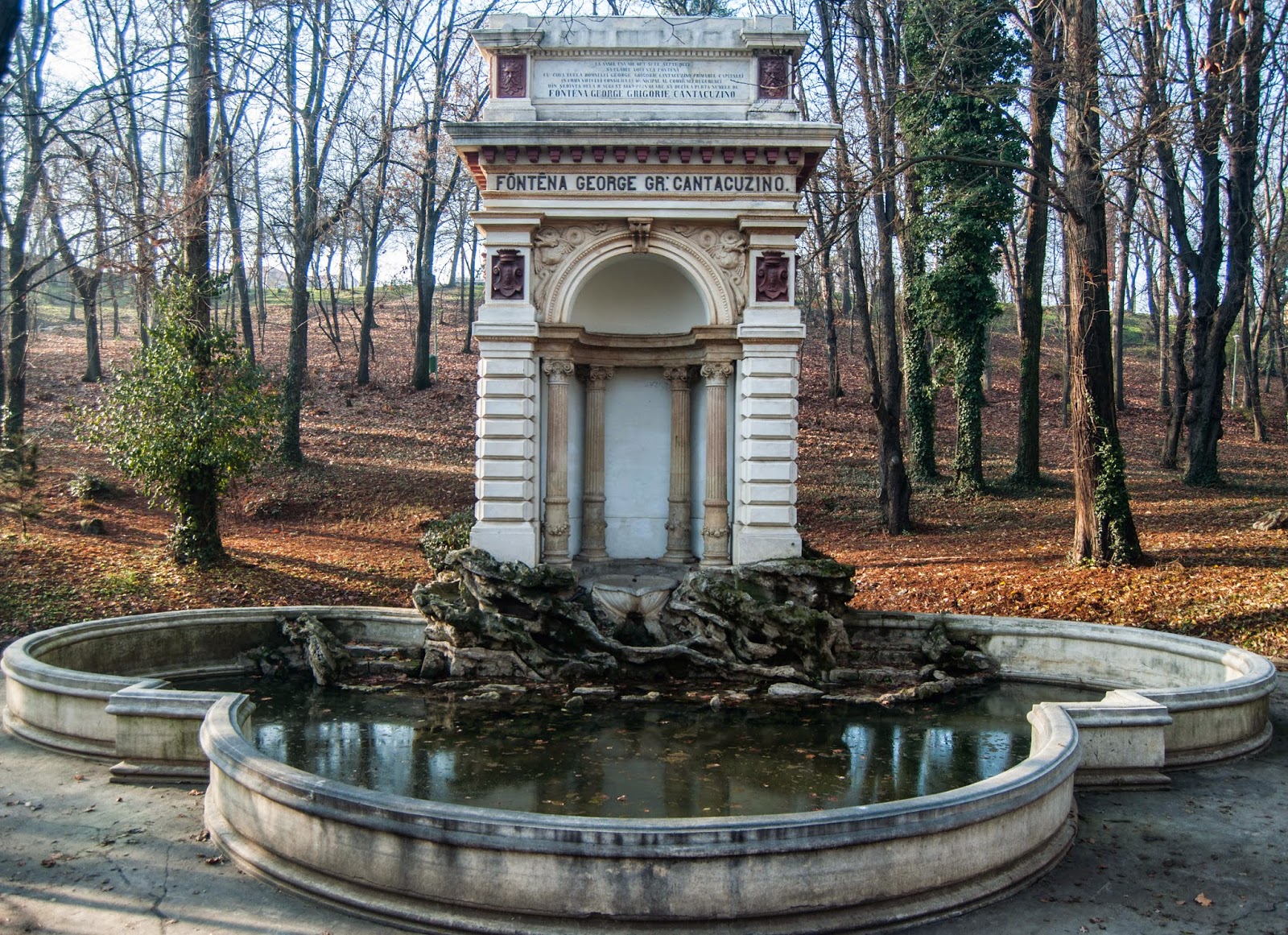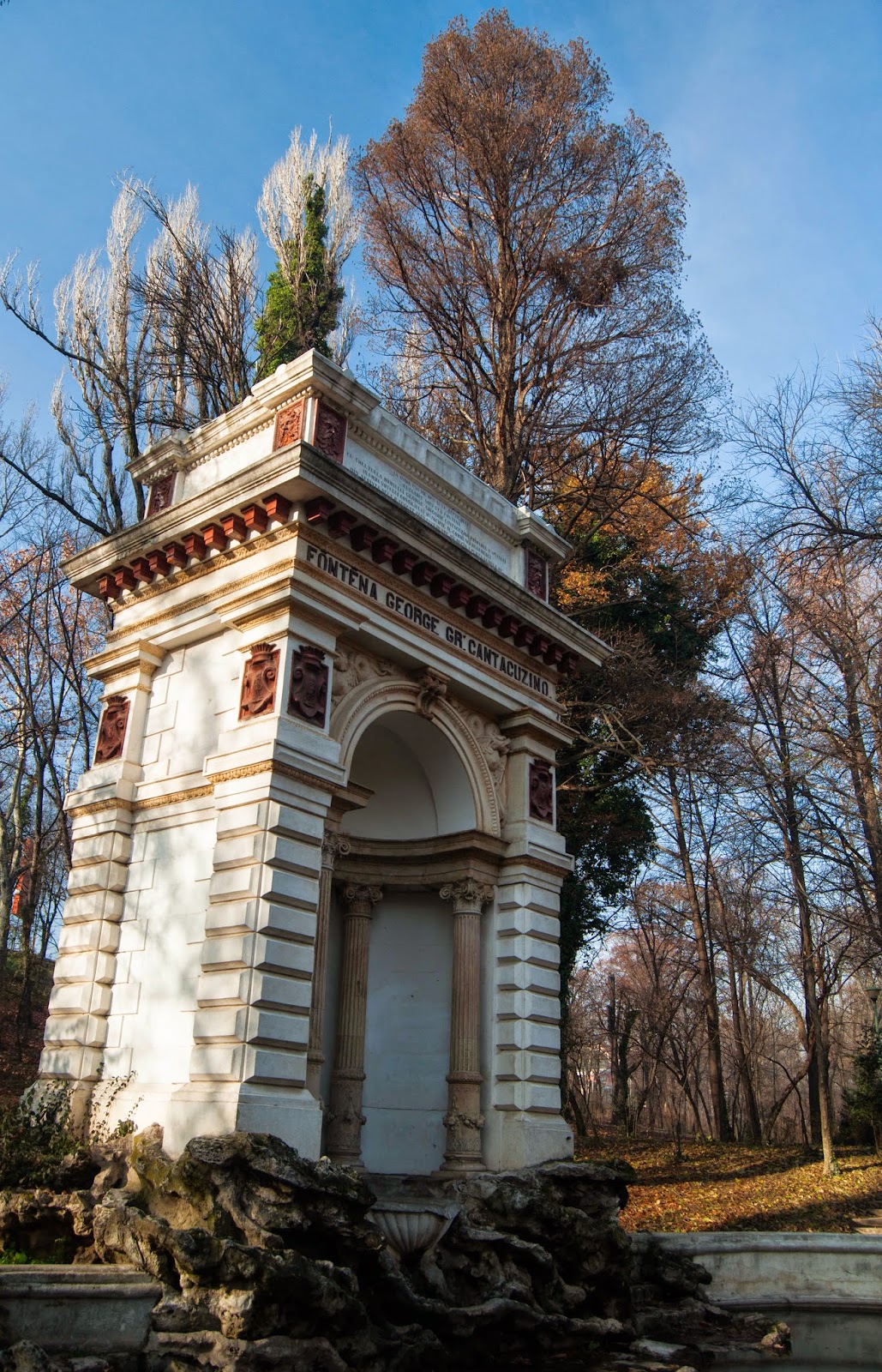 Coborand prin parc, ajungem la Fantana George Grigorie Cantacuzino, construita in 1870 in stil neoclasic. Cheltuielile au fost suportate chiar de George Cantacuzino iar proiectul a fost realizat de arhitectul Al. Freiwald si sculptorul Karl Storck (sculptor roman de origine germana, stabilit in Bucuresti in 1849).