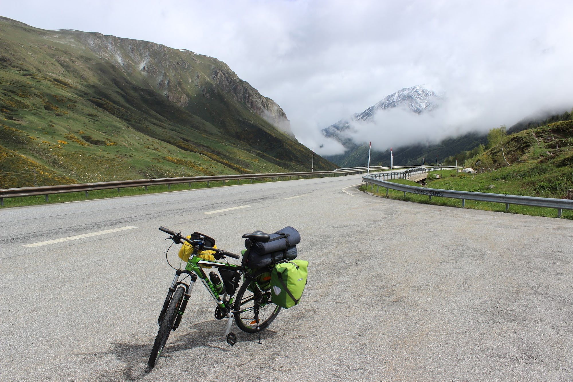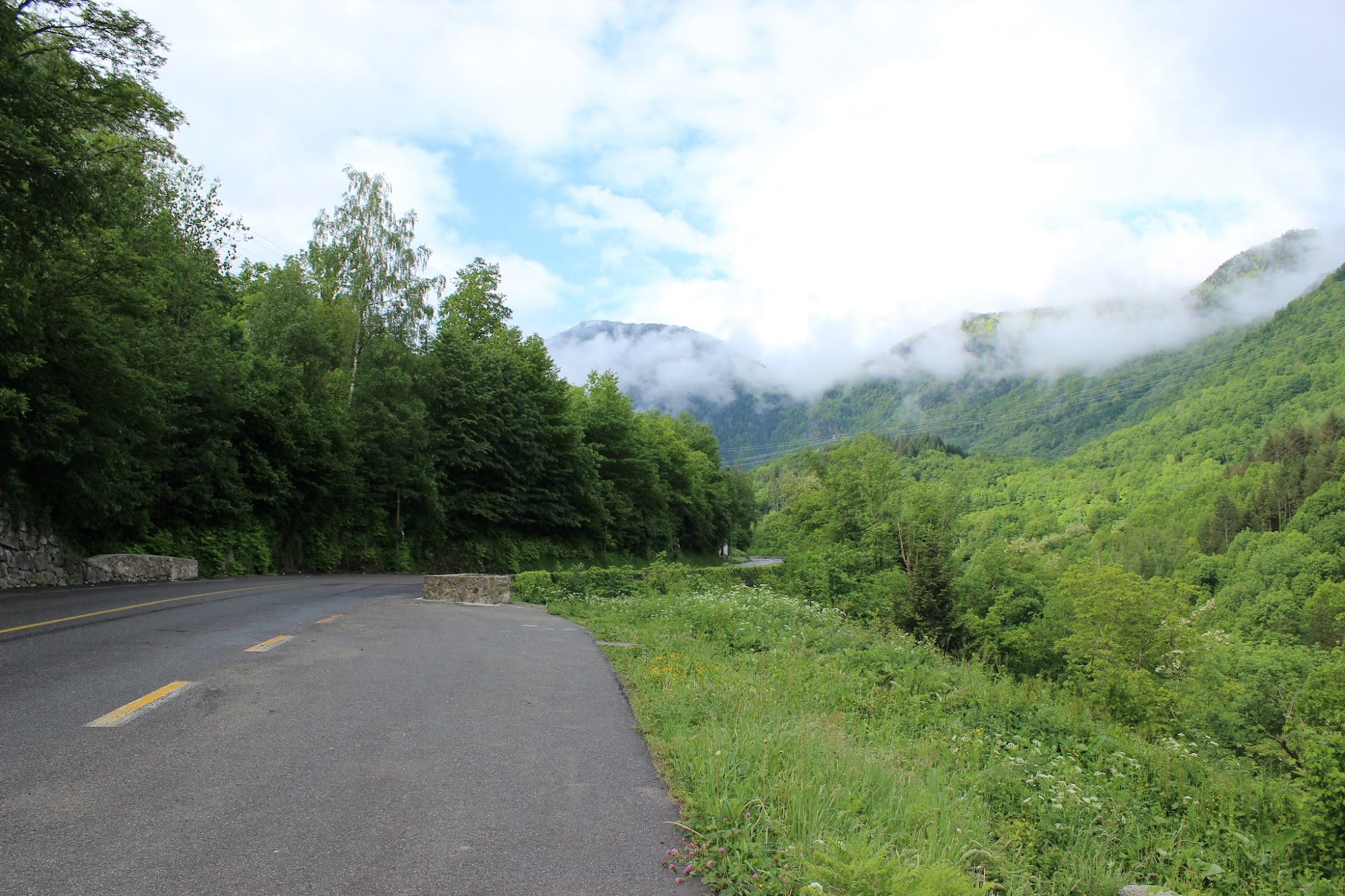 Vremea e mohorata, cu norii foarte josi si care se deplaseaza rapid printre culmi. Rar reusesc sa vad albastrul cerului. Verdele crud al muntilor imi acopera toata privelistea. Dupa ce trec kilometrii si castig in altitudine, nuantele de verde capata alte dimensiuni, pe masura ce foioasele cedeaza usor teren coniferelor. Si mai sus, cand vegetatia se rareste, un covor de flori inveseleste muntele. Cred ca sunt maci galbeni. Tot acolo, dupa ce norul binevoieste a-mi elibera orizontul, vad si varfurile inzapezite.