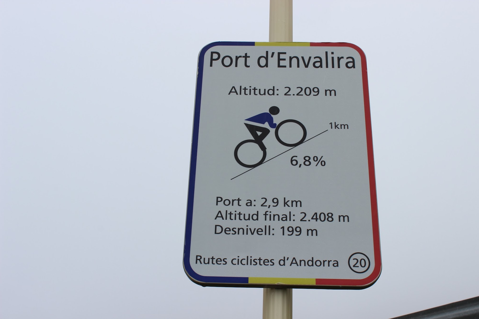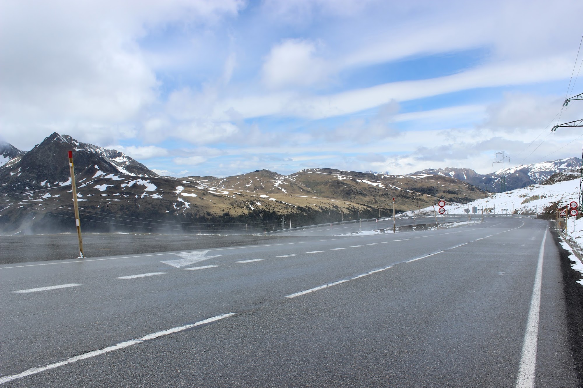 Spre sfarsitul urcarii totul devine alb. Din fericire mai putin soseaua, care este impecabila. Temerile mele legate de practicabilitatea acesteia n-au fost confirmate. Stratul de zapada este consistent desi temperatura este usor pozitiva. Dupa ora 2 ajung in varf, punctul cel mai inalt al excursiei. Port D’Envalira 2408 m. Soseaua acestui pas montan este cea mai inalta din muntii Pirinei, iar aceasta urcare a fost folosita in cateva randuri in curse de ciclism ca Turul Frantei sau Turul Spaniei.