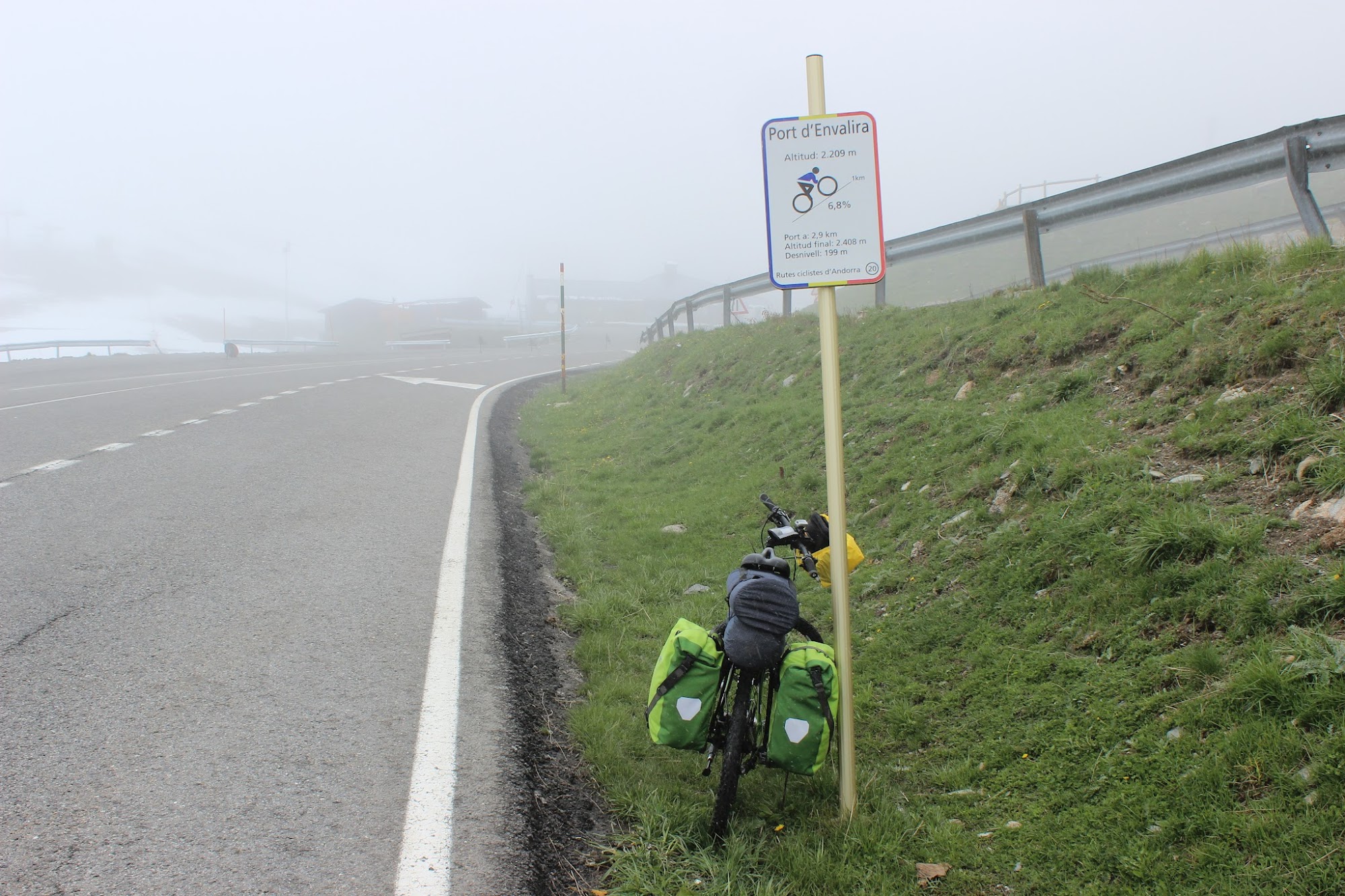 Refuz tunelul si-mi continui urcarea. Daca esti dornic de peisaje spectaculoase acesta este traseul de urmat. In cateva sute de metri ajung in locul numit Pas de la Casa, unde e si granita intre Franta si Andorra. Un loc cu multa vanzoleala. Localnici cu treburi si turisti deopotriva misuna in acest loc mic si aglomerat de infrastructura turistica. Totul e cufundat in ceata. Dupa cateva pedale castig in altitudine si reusesc sa vad cat de cat o perspectiva a locului. Imi sare in ochi arhitectura destul de sobra si acoperisurile negre ale cladirilor. Totusi arata foarte bine. Mi se pare ca se incadreaza perfect in peisaj.