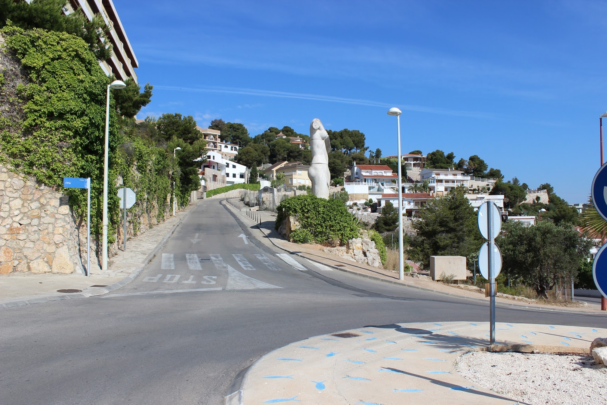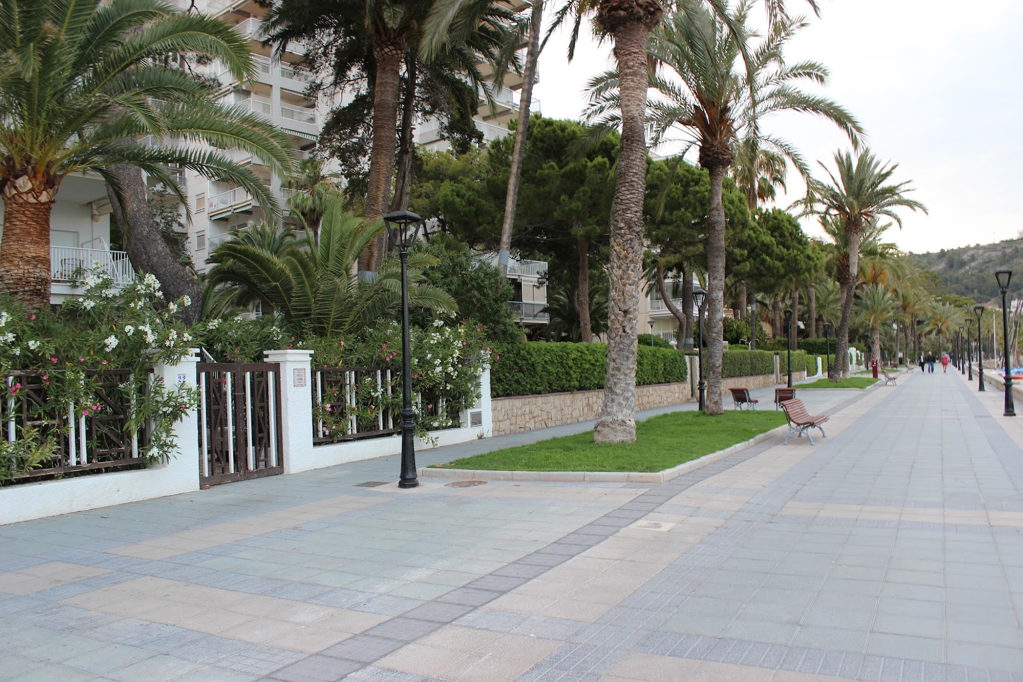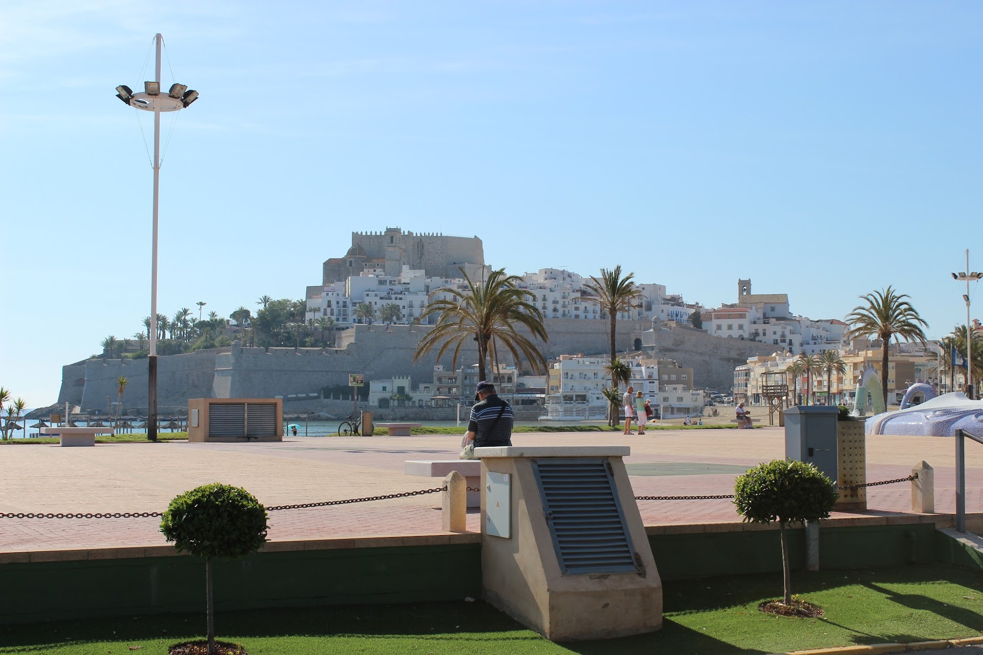 La plecare, cu prilejul traversarii orasului am mai admirat castelul si imprejurimile acestuia. Cladirile au colori deschise, in special alb. Plajele isi au deja turistii lor. Acestea sunt intinse, curate si cu nisip fin. Traseul ne duce catre sudul orasului, undeva la inaltime. Prilej de a ne masura inaltimea cu cea a castelului. Mai departe drumul urca in cartierul Papa Luna, o zona rezidentiala foarte linistita. Acolo drumul trasat se transforma in poteci care se pierd in stancile impadurite de deasupra. Este masivul Sierra de Irta, format din doua lanturi muntoase, avand inaltimea maxima de 572 in varful Campanilles. Nu ma voi baga pe pantele astea abrupte, uscate si tepoase. Ma intorc sa caut un drum abordabil. Inainte de asta luam un mic dejun frugal, pe o banca, la umbra.